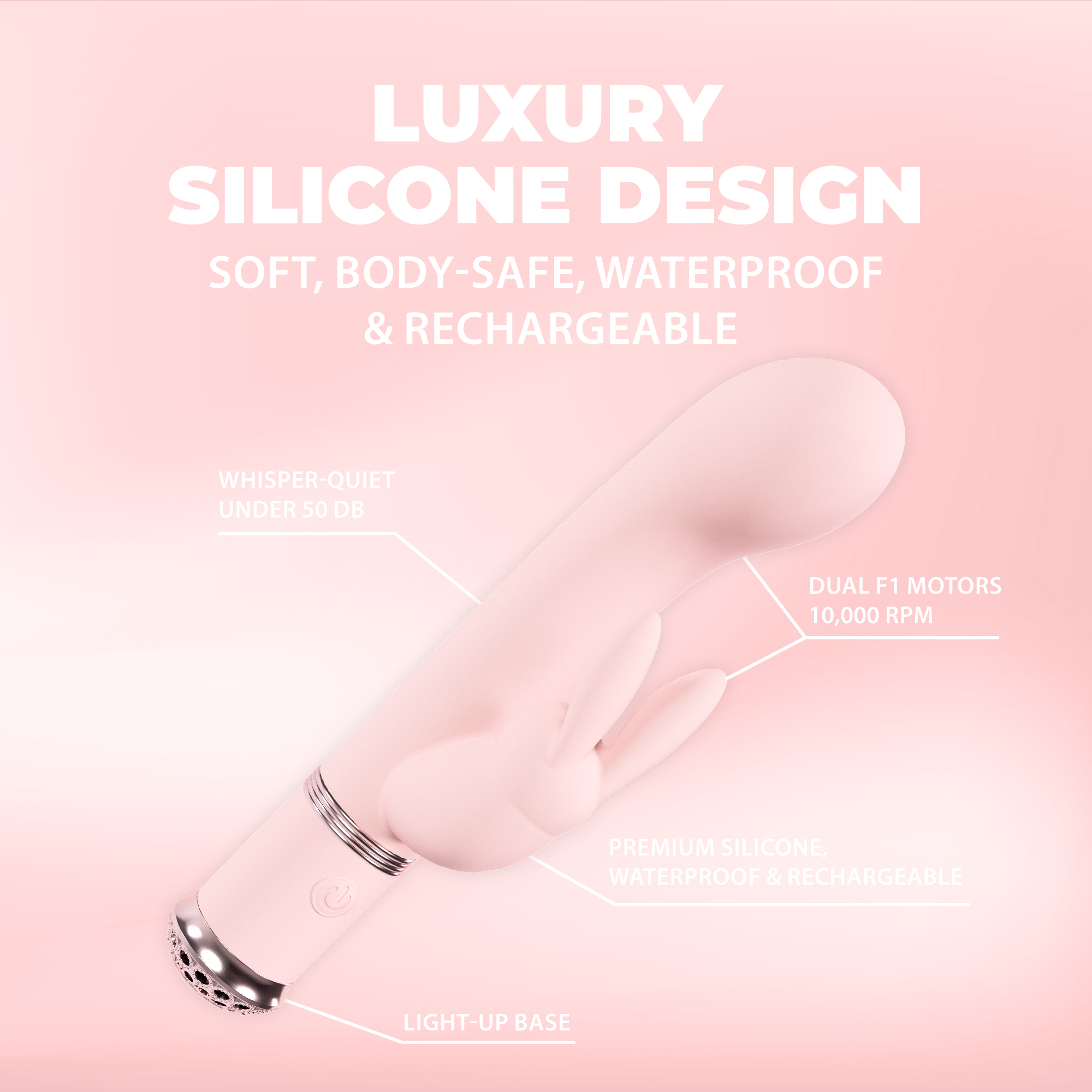 Luxe silicone rabbit vibrator met krachtige F1-motoren, 10.000 rpm, kleurverlichting, stil gebruik (<50 dB) en 55 minuten speeltijd. Waterproof en elegant.