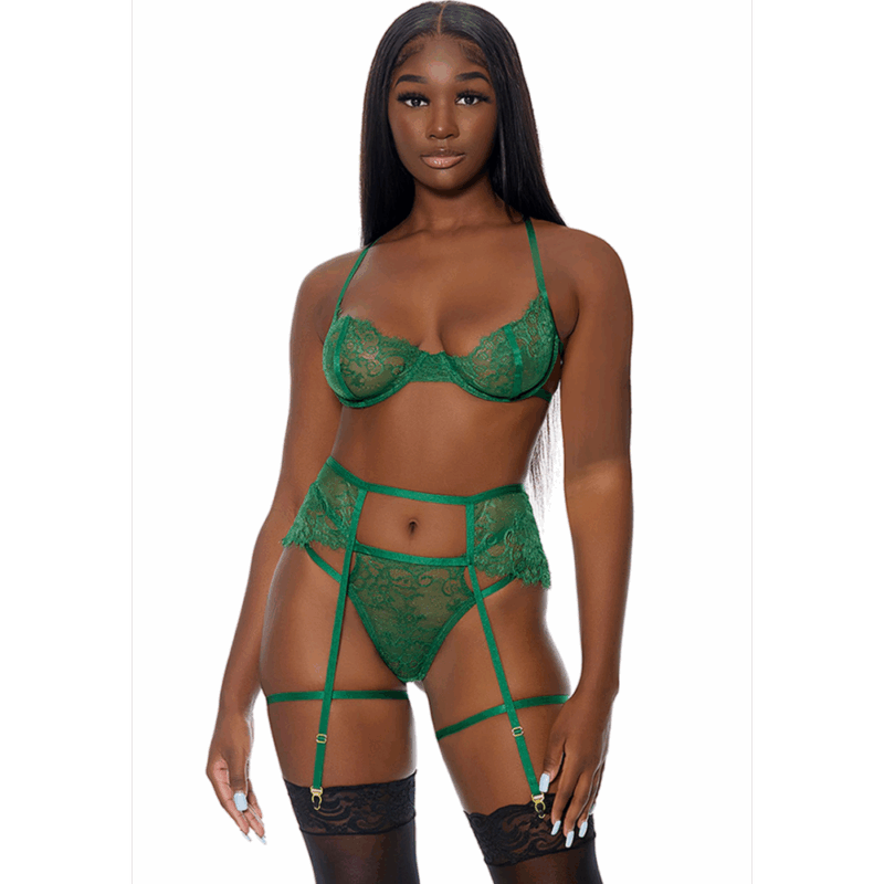 Elegante 3-delige kanten lingerie set met jarretelgordel en panty — perfect voor verleiding en zelfvertrouwen.