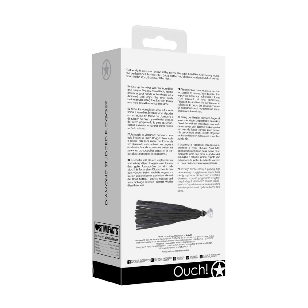 De diamanten studded whip tilt elke aanraking naar een hoger, intenser niveau. Het handvat is versierd met glinsterende diamantdetails, waardoor je niet alleen volledige controle voelt, maar er ook oogverblindend uitziet tijdens het spel. De lange, stevige leren riemen bewegen soepel mee en geven precies de sensatie die jij wilt opwekken — van zachte, tintelende plagerijen tot diepe, krachtige slagen. Daardoor wordt elke aanraking een bewuste keuze, geladen met spanning en verlangen.
