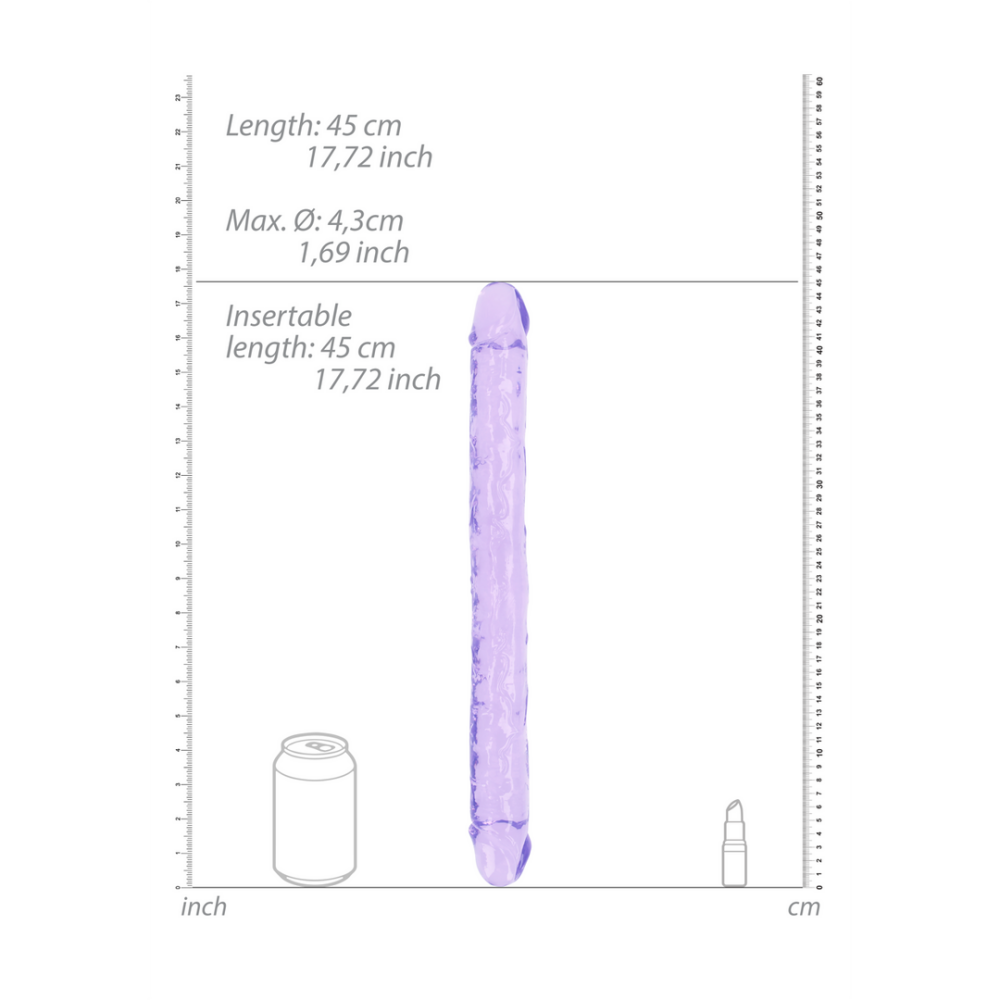 Transparante, flexibele double dong van 45 cm. Perfect voor dubbelzijdige diepe stimulatie, solo of samen. Lichaamsveilig en soepel voor intens spel.