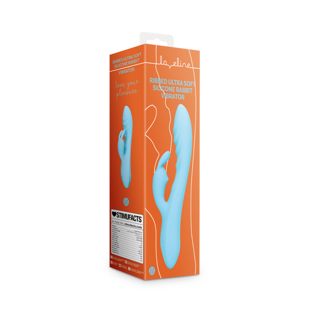 Lichtblauwe ultra zachte rabbit vibrator met ribbels en dubbele stimulatie. Ontworpen voor diepe G-spotplezier en intens clitoraal genot.