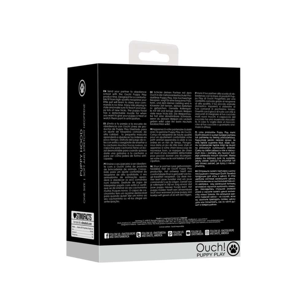 Treed binnen in de wereld van Puppy Play met het Neopreen Puppy Mask. Dit zwarte masker uit de Ouch!-collectie is perfect voor wie wil spelen met gehoorzaamheid, rolverdeling en verleiding. Het ontwerp is geïnspireerd op klassieke puppy play accessoires en combineert comfort, speelsheid en controle in één verleidelijk pakket.