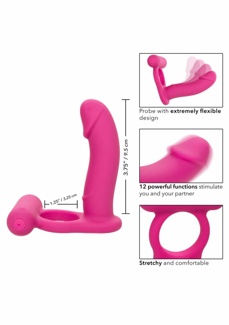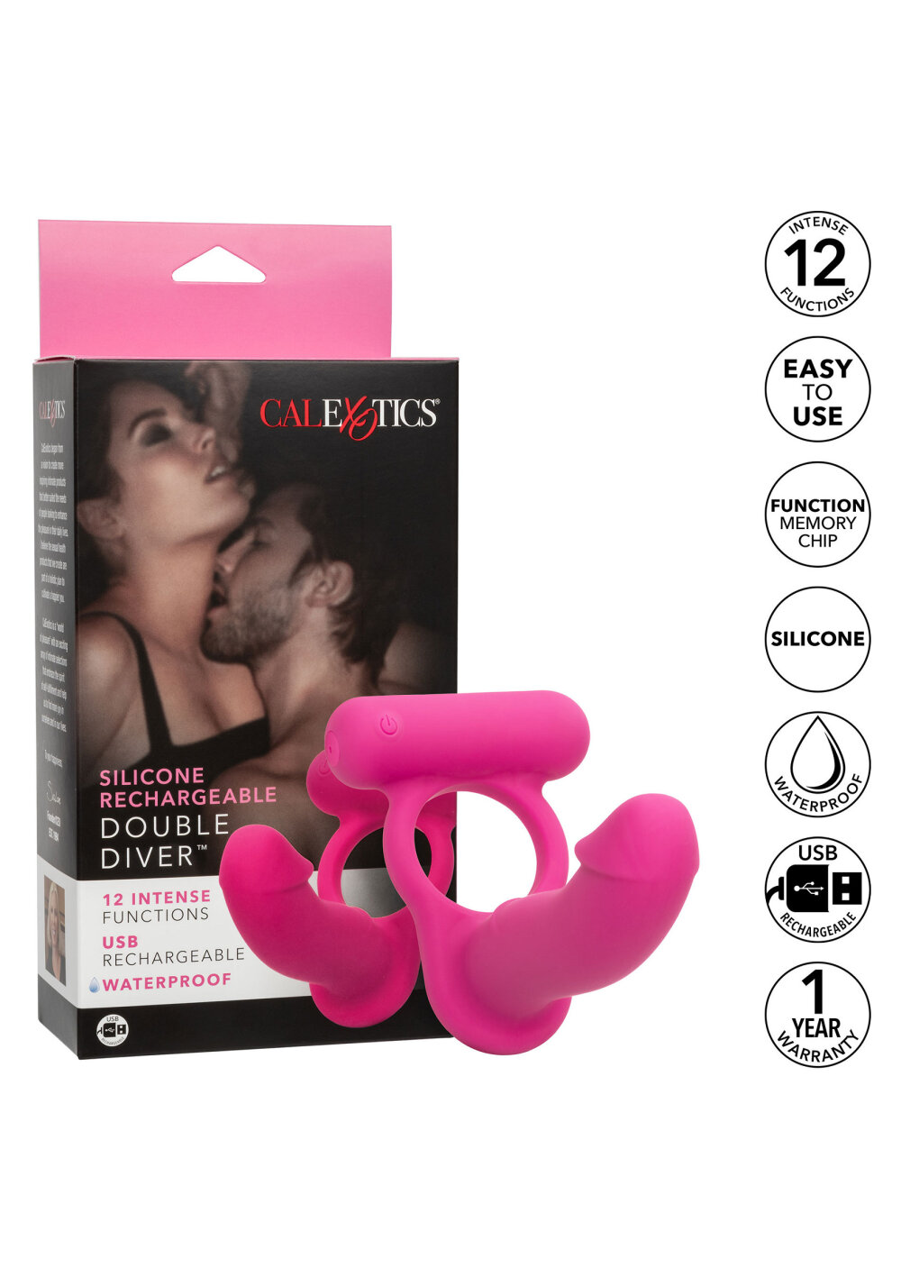 Ervaar ultiem genot voor twee met de CalExotics Silicone Rechargeable Double Diver – een luxe, oplaadbare cockring die drie sensaties in één combineert: krachtige vibraties, diepe anale stimulatie en intense clitorisstimulatie. De rekbare siliconen ring houdt je stevig vast, verhoogt de gevoeligheid en verlengt je uithoudingsvermogen, terwijl de gebogen anale probe en de vibrerende teaser zorgen voor volledige stimulatie aan beide kanten.