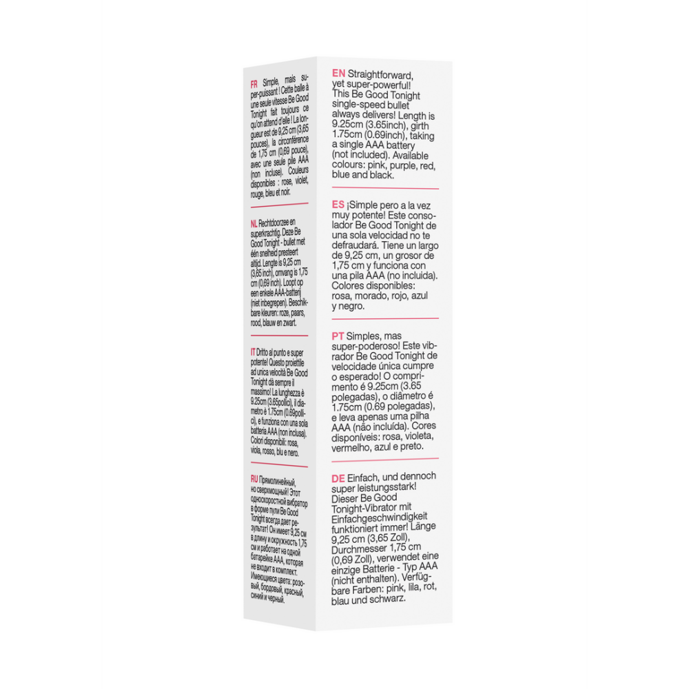 De single-speed bullet vibrator werkt op één AAA-batterij. Daardoor kun je hem overal gebruiken, zonder oplader. Het gladde oppervlak voelt prettig tegen de huid en laat vibraties krachtig doorkomen. De bullet is verkrijgbaar in verschillende kleuren. Daardoor kun je eenvoudig een model kiezen dat past bij jouw stijl of stemming.