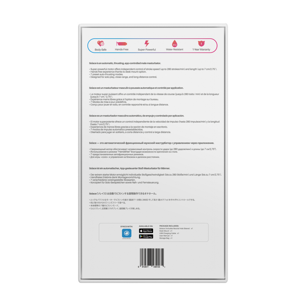 Ervaar next-level genot met de Solace Automatische Masturbator – de slimme, app-gestuurde masturbator die jou totale controle en ultieme sensatie geeft. Deze hightech masturbator biedt automatische duwbewegingen tot wel 280 slagen per minuut, waardoor je intens realistische stimulatie beleeft, helemaal handsfree.