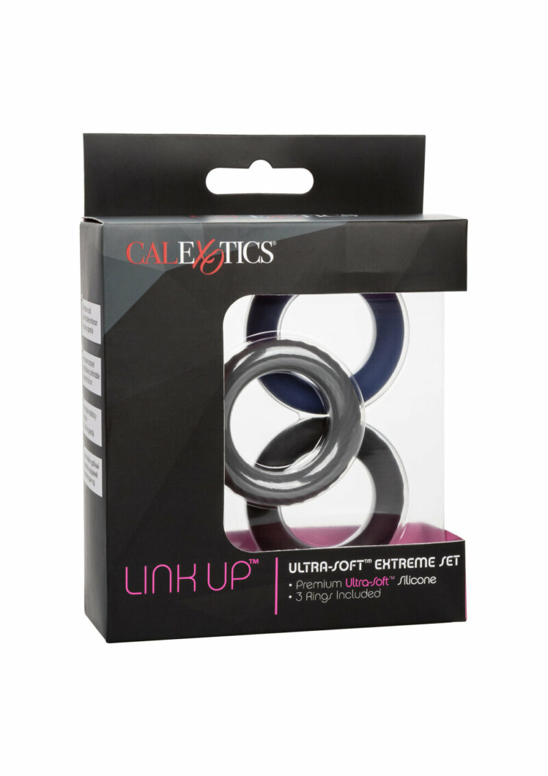 Verleg je grenzen met de CalExotics Link Up Ultra-Soft Extreme Set – een exclusieve set van drie siliconen cockringen die kracht, comfort en stimulatie combineren voor maximale prestaties. Elke ring in deze set van topkwaliteit heeft een diameter van 3,75 cm en een unieke stimulerende textuur, speciaal ontworpen om variatie en intens genot te bieden.